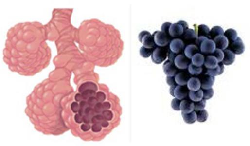 Grapes resemble the alveoli of the lungs. The lungs are made of branches of ever smaller airways that finish up with tiny branches of tissue called alveoli. These structures allow oxygen to pass from the lungs to the blood stream. A diet high in fresh grapes has shown to reduce the risk of lung cancer and emphysema. Grape seeds also contain a chemical called proanthocyanidin, which is thought to reduce the severity of asthma triggered by allergy. One reason that premature babies struggle to survive is that these alveoli do not begin to form until 23 to 24 weeks of pregnancy.